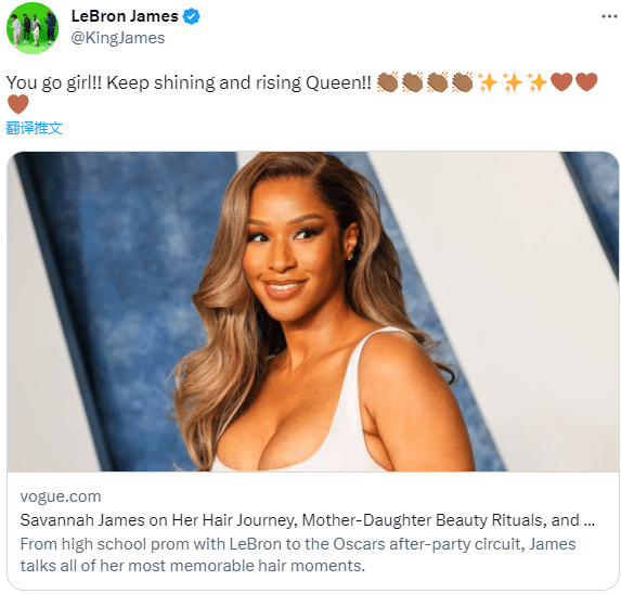 178直播03月15日讯 ,近日,詹姆斯夫妇参加了奥斯卡派对,萨瓦娜更是接受专访,期间萨瓦娜透露詹姆斯喜欢她是金色女郎,因此萨瓦娜经常戴假发参加活动;詹姆斯转发爱妻的专访并且配文写道:继续闪耀和崛起吧,女王!詹姆斯又夸赞爱妻,随队出征客场,比赛期间老詹和拉塞尔疯狂庆祝,将在一周后接受复查。