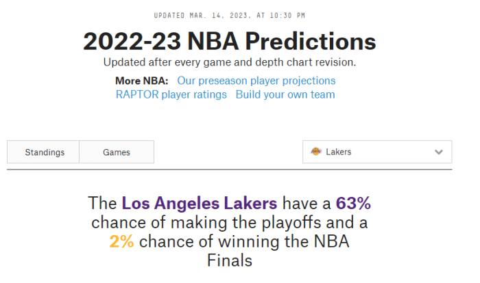 湖人赢球后战绩变成34胜35负,从西部第9掉到西部第10位,但据权威网站FiveThirtyEight预测,湖人晋级季后赛的最新概率为63%。