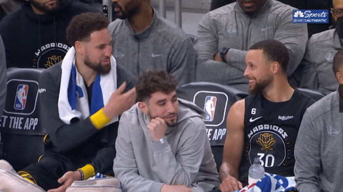 水花坐在替补席休息时,库里和汤普森开怀畅聊并且开怀大笑,开心之情溢于言表,勇士主场也是一片欢腾。