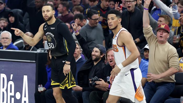 首节比赛,水花兄弟在打通中心掀起巨浪,汤普森外线神准以及多次攻击篮筐,单节9中7爆砍18分,库里同样不可阻挡,无视布克轰进三分,单挑妹夫轰进后撤步三分并且挥拳怒吼庆祝,水花单节投进7记三分爆砍30分,勇士第一节43-21领先太阳22分。
