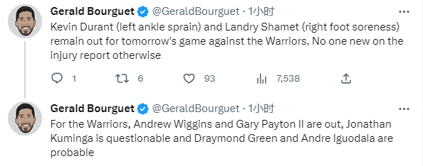 太阳下一场对阵勇士,杜兰特(左脚踝扭伤)和沙梅特(右脚酸痛)都无法出战,其他球员都可以出战;勇士球员维金斯(个人原因)和小佩顿因伤继续休战,库明加(脚踝扭伤)出战成疑,德拉蒙德-格林和伊戈达拉都是大概率出战。