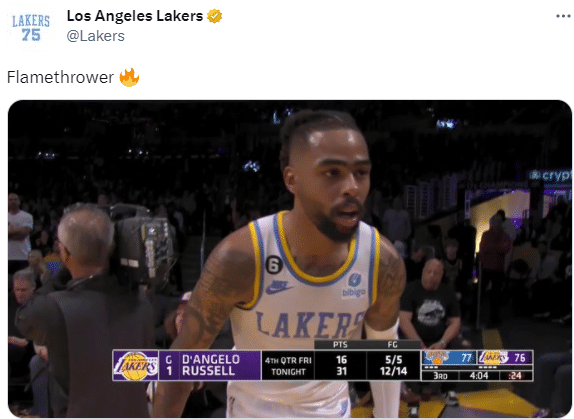 拉塞尔三节14投12中轰下31分,湖人官方盛赞他是火焰喷射器;第三节期间,拉塞尔和浓眉坐在替补席拿着平板研究录像,詹姆斯溜达一会后也和他们交流,之后拉塞尔起身走开,把座位还给詹姆斯。