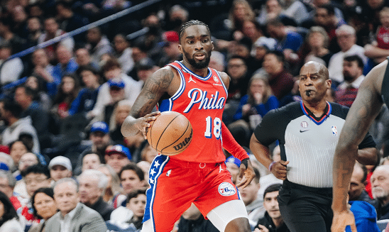 第三节,球队大比分落后,哈登正面追身三分球轰进。哈登自投自抢,补篮得分。三节结束时,76人已经将分差缩小到11分。