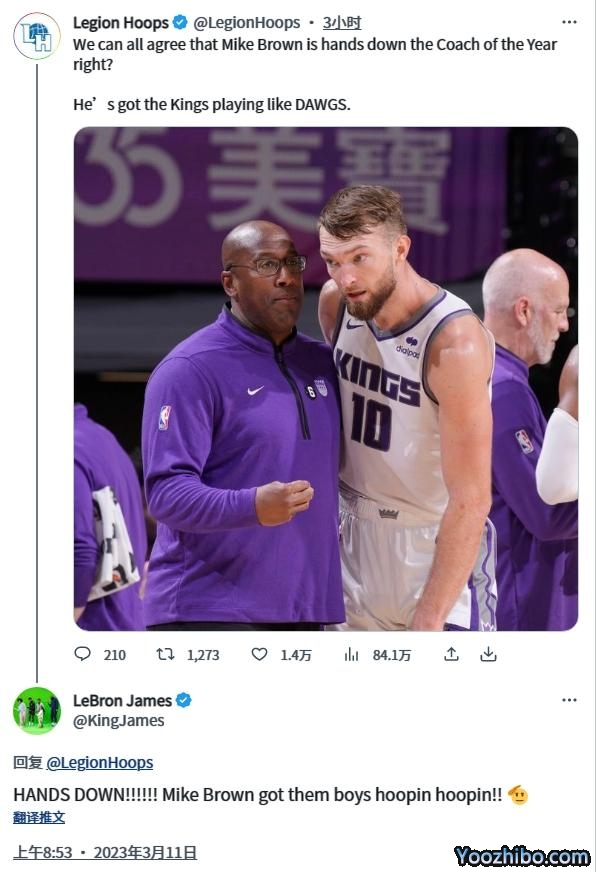 美媒Legion Hoops发推写道:“我们都同意迈克-布朗毫无疑问是年度最佳教练,没错吧?他让国王队打得像狗(褒义词)一样!