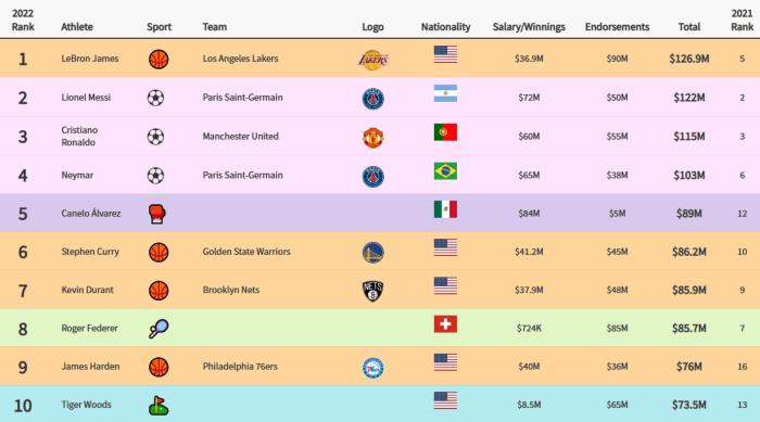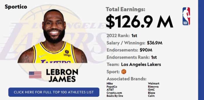 据美国体育商业媒体Sportico报道,詹姆斯2022年总收入1.269亿美元,其中工资3690万美元,其他收入9000万美元,排名全球运动员第一名,这也是其20年职业生涯中单年的最高值。
