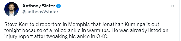 178直播讯03月10日,勇士新星库明加遭遇杜兰特式悲剧,因伤无缘出战灰熊,据勇士主帅科尔透露,库明加在赛前热身时扭伤了脚踝,将缺席今日比赛。