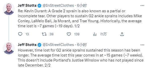 医学专家Jeff Stotts表示脚踝二级扭伤也被称为部分或不完全撕裂,从历史上来看,二级扭伤平均伤停19天,大概缺席7场比赛,但本赛季球员遭受如此伤病缺席的时间更久,平均缺席15场比赛,大概休战7周。