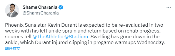 178直播讯03月10日,杜兰特的脚踝检查结果曝光,据名记shams报道,杜兰特的左脚踝扭伤,预计伤停2周并根据康复进展情况复出,杜兰特脚踝肿胀已经消退,所幸免遭严重伤病,避免常规赛报销;太阳官宣杜兰特至少伤停3周。