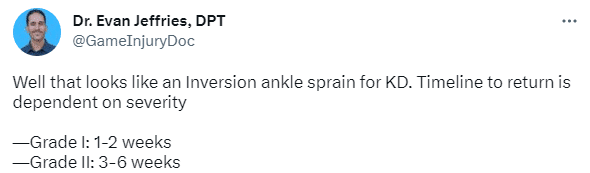 178直播讯03月09日,太阳对阵雷霆本该是杜兰特的太阳主场首秀,可赛前热身时杜兰特不幸遭遇90度崴脚,因伤提前退出比赛;据报道杜兰特的脚踝肿胀,医学专家详解KD伤情,至少伤停1周,严重的话二级扭伤需伤停3-6周。