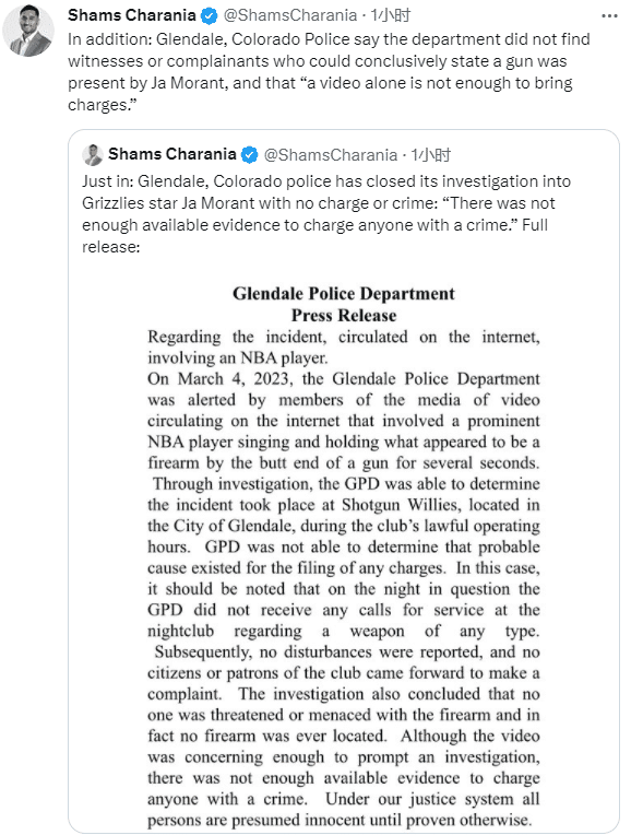 莫兰特持枪事件引起轩然大波,NBA联盟仍在彻查与莫兰特持枪有关的事件,不过当地警方的调查已经结束,确认莫兰特无罪。