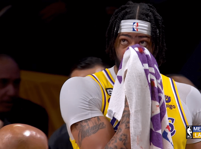 第二节6分43秒,浓眉保护篮板,罗迪一巴掌打到浓眉的面部,鼻梁处被划开了一个口子,浓眉的鼻子血流不止,鲜血染红了毛巾和球衣,之后浓眉坐在替补席,湖人队医为他止血却止不住,随后浓眉因伤返回更衣室接受治疗;值得一提的是,裁判仅仅吹罚普通犯规。
