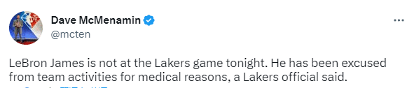 詹姆斯不仅缺席比赛,而且没有来到现场看比赛,缺席加索尔的16号球衣退役仪式,湖人官方给出的解释由于医疗原因,詹姆斯今日已获准可以不参加球队活动。