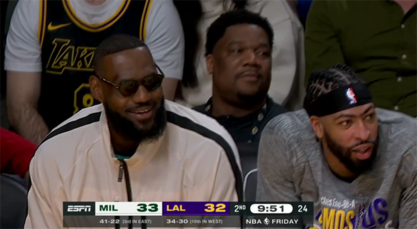 由于遭遇左脚踝伤势的困扰,詹姆斯缺席湖人与雄鹿的焦点战,拉塞尔命中9记三分并且狂砍44分9助攻6篮板,末节21分并且送出准绝杀,丁威迪封盖利拉德送出制胜盖帽,最终湖人1分险胜;詹姆斯坐在场边仍旧引热议。