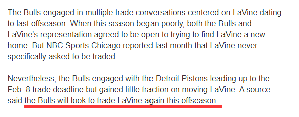 从去年休赛期开始,公牛就公开兜售拉文,在今年交易截止日,公牛再次积极交易拉文,双方都同意进行交易,不过拉文的交易没有取得进展,与活塞进行谈判也收效甚微。