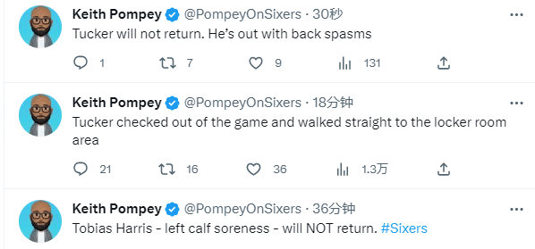 哈里斯上半场仅仅只打了13分钟,2投1中按到3分2篮板,,中场休息时,76人方面宣布,哈里斯因左小腿酸痛提前退出本场比赛。