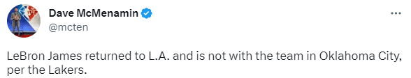 178直播讯03月02日,詹姆斯、浓眉和拉塞尔三大主力都因伤缺战雷霆,据报道,詹姆斯已经提前返回洛杉矶,暂时离开球队,未随队前往俄城。