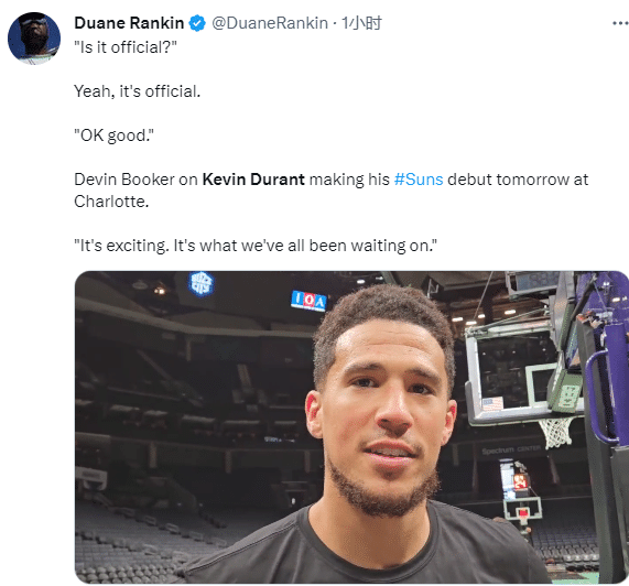 178直播讯03月01日,菲尼克斯太阳队官方正式宣布,杜兰特将在明天对阵黄蜂的比赛中迎来太阳生涯首秀,还发布杜兰特首秀预告片,杜兰特因伤连续缺席20场比赛后,他终于迎来复出以及太阳首秀;杜兰特自曝膝盖早已不再痛疼,布克超级兴奋。