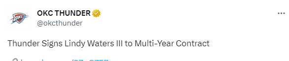 雷霆官方宣布,正式与后卫林迪-沃特斯签下一份多年续约合同,据报道,他们双方签下2年380万美元的合同,第二年(2023-24赛季)为球队选项。