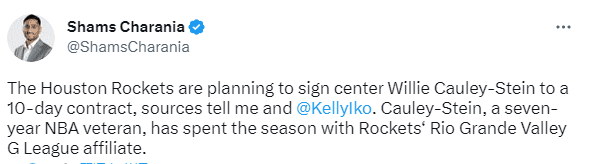 据名记Shams Charania报道,火箭计划与中锋威利-考利-斯坦签下一份10天短合同;去年休赛期,斯坦曾与火箭签下一份1年无保障合同,随后被裁,本赛季一直效力于火箭发展联盟下属球队。