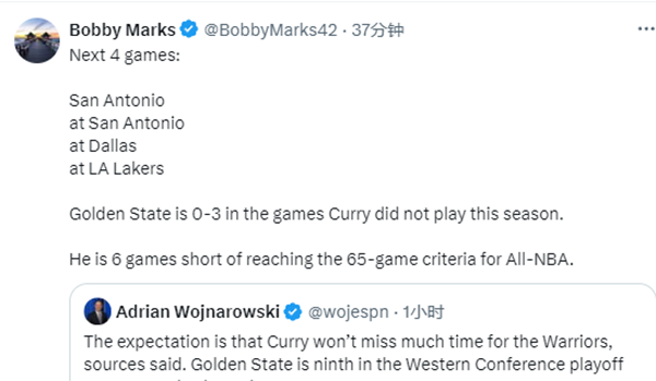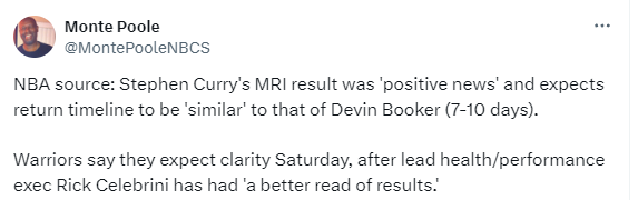 勇士记者Monte Poole报道,库里的MRI检查结果是积极的,预计他的复出时间与布克相似(缺席7-10天),勇士队预计明天公布库里的伤情。