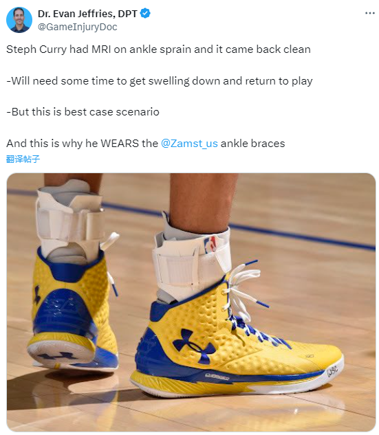 对于库里的伤情,医学专家Evan Jeffries库里需要一些时间来消肿,然后恢复比赛,这是最好情况,这也是库里佩戴脚踝支架的原因。