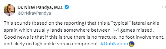 医学专家Nirav Pandya表示这是常见的脚踝外翻扭伤,通常会缺席1-4场比赛,好消息是他的脚踝没有骨折,并且很可能没有高位脚踝扭伤,接下来库里将接受消肿治疗,同时恢复脚踝的力量。