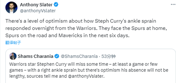 shams报道表示库里将因脚踝伤势缺席一段时间,至少休战一场或几场,但预计他的缺席时间不会太长;勇士随队记者Anthony Slater表示勇士对库里的情况持乐观态度。