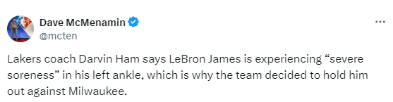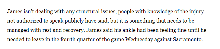 湖人随队记者DaveMcMenamin跟进报道:詹姆斯的脚踝伤势是劳损造成的,这不是新伤,我被告知,直到一小时前,他仍在接受治疗,希望能够出战今天与雄鹿的比赛。