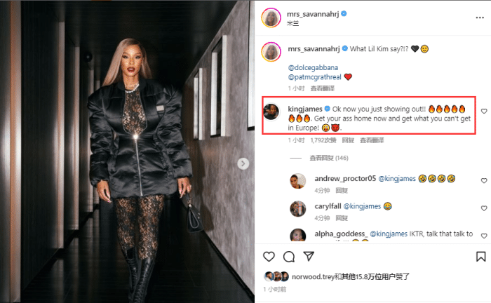 178直播讯02月26日,近日詹嫂萨瓦娜参加米兰时装周,身穿蕾丝透视打底出镜,性感亮相并且拍摄大片,38岁詹姆斯在老婆评论区留言写道:赶紧给我回家,家里有你在欧洲得不到的东西。