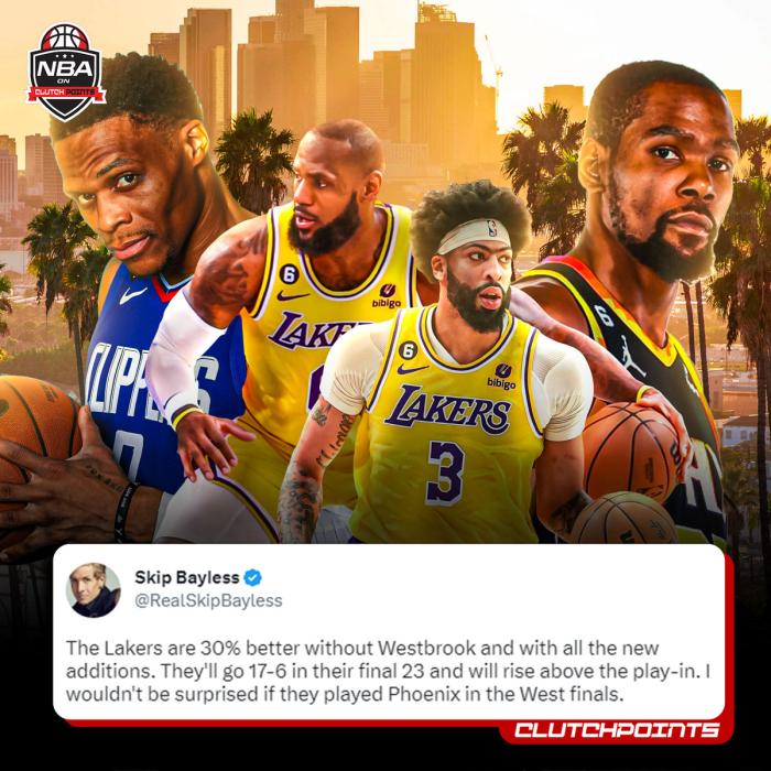 目前湖人势头正好,名嘴Skip Bayless表示威少离队后,湖人在新援的帮助下比以前的表现要好30%,最后23场他们将拿到17胜6负并直接晋级季后赛,并且相信湖人能打进西决大战太阳。