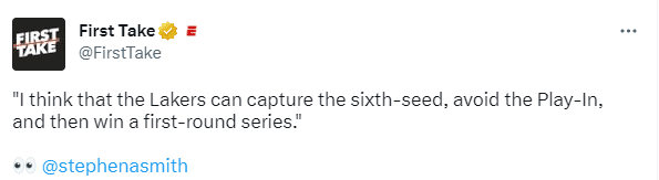名嘴A-史密斯表示:我认为湖人能拿到西部第六从而避免附加赛,他们能够赢得季后赛首轮系列赛。
