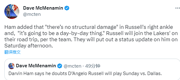 预计湖人队将在本周日上午更新拉塞尔的伤势,拉塞尔将随队出征客场,这暗示他的脚踝伤势没有太严重,医学专家Evan Jeffries表示这是一个好消息,他应该正接受全天候治疗。