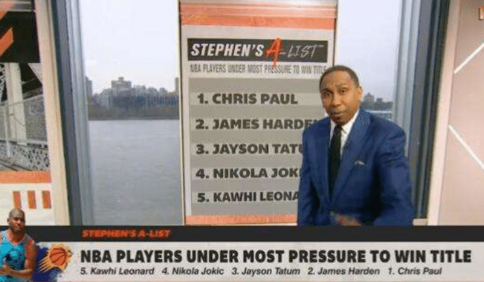 178直播讯02月24日,NBA现役球员之中谁的夺冠压力最大?美名嘴斯蒂芬-A-史密斯在节目中,列出了他心目中夺冠压力最大的球员,在这份名单的球员有:克里斯-保罗、詹姆斯-哈登、杰森-塔特姆、尼古拉-约基奇和科怀-莱昂纳德。