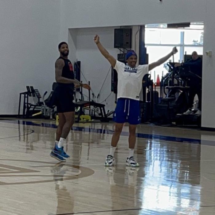 训练之余,威少和乔治比拼超远三分,威少坐在地板上等待正在底角加练三分的小莫,并且说直到小莫投丢他们才会开始PK,小莫手感滚烫,连续命中30记三分;整个过程中,威少都是满脸笑容,开心之情溢于言表。