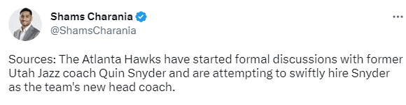 据名记shams报道,老鹰正在专注于聘请前爵士主帅奎因-斯奈德担任球队新帅,他们双方已经进行了线上谈话,即将进行面谈;老鹰追求斯奈德的原因是因为后者具备塑造球队文化的能力,并使每一位球员肩负责任感。