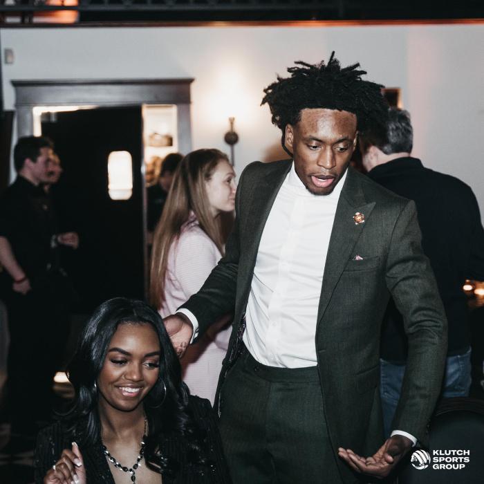 38岁的詹姆斯身穿一件绿色针织外套,搭配黑色紧身裤和白色运动鞋,萨瓦娜身穿礼服盛装出席;在全明星周末期间,里奇-保罗安排了一场旗下球员及其家属一起参加的晚宴,老詹夫妇搞怪合影,和克拉克森交流时,詹姆斯和萨瓦娜都咧嘴大笑乐开怀。