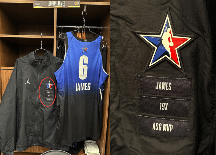 NBA全明星集体拍摄定妆照,今年全明星赛,詹姆斯队将会身穿蓝黑配色的球衣,字母哥队则身穿橙黄配色的球衣,他们的球衣和全明星外套都已挂在各自的更衣柜中。