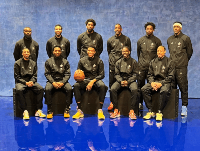 詹姆斯双手抱球坐在C位,满脸笑容,凸显队长和全明星票王的身份,詹姆斯左右两侧坐着欧文和莫兰特,坐在第一排的球星还有利拉德、福克斯;东契奇、约基奇、小贾伦-杰克逊、爱德华兹、马尔卡宁、小萨博尼斯和亚历山大都站在后排。