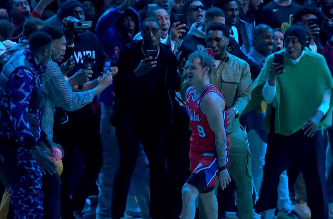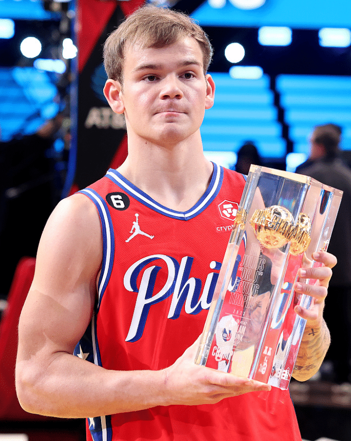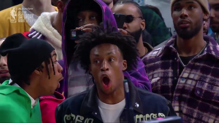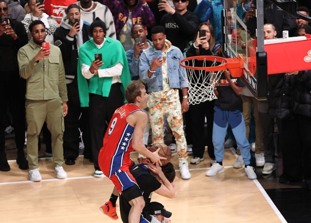 1米88迈克朗上演疯狂一扣,飞跃两人打板反扣点燃球馆,获得评委一致好评,满分50分,字母哥等球星都露出不敢相信的夸张反应;第二扣,迈克朗风车转体双手暴扣,49.8分险些满分。