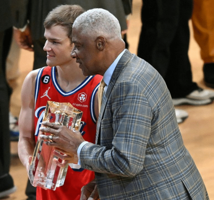 J博士把扣篮冠军奖杯递给迈克朗,后者高举奖杯庆祝,1米88迈克朗完美表现拯救扣篮大赛;赛后表态明年才会参加扣篮大赛。