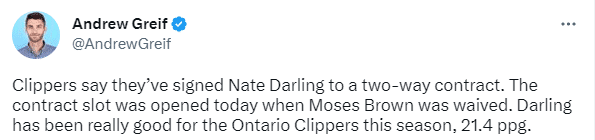 快船裁掉一名替补中锋,然后和内特-达林签下一份双向合同,本赛季,内特-达林在快船队发展联盟附属球队场均拿到21.4分,身高1米98司职得分后卫。