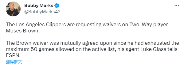 根据ESPN报道,经纪人透露,快船将会裁掉中锋摩西-布朗,布朗与快船双方达成一致,原因是布朗的出战场次数已达到双向合同规定最高50场比赛的上限。