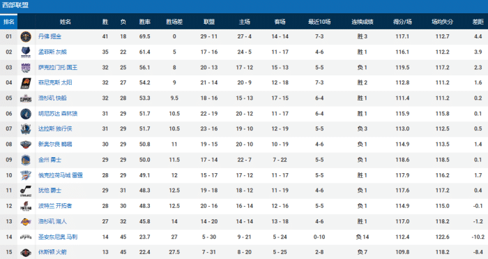 178直播讯02月16日NBA常规赛继续进行,西部的掘金击败独行侠,迎来3连胜,稳居西部第一。灰熊击败爵士、暂居西部第二。马刺不敌黄蜂,湖人大胜鹈鹕避免连败,接下来我们一起来看看西部最新排名: