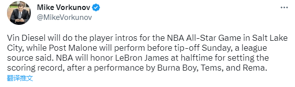 据美记Mike Vorkunov报道,NBA官方将在盐湖城全明星正赛中场休息时为詹姆斯举办致敬仪式,庆祝他加冕NBA历史得分王,目前詹姆斯总得分是38390分,排名历史第一。