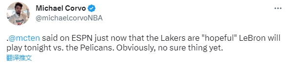 据ESPN名记Dave McMenamin报道,湖人希望詹姆斯今天能够复出战鹈鹕,不过一切都还没有确定;此前湖人把詹姆斯的状态列为出战成疑,确定复出。