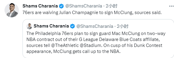 据记者Shams Charania报道,76人计划与后卫马克-麦克朗签下一份双向合同;为了签约麦克朗,76人将裁掉前锋朱利安-尚帕尼,腾出一个大名单位置。随后76人官宣,后者穿9号