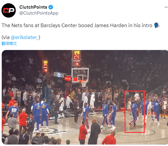 哈登身穿76人球衣重返布鲁克林,现场DJ介绍哈登入场时,现场响起漫天嘘声;比赛正式开打后,只要哈登拿球,现场就会响起嘘声,在这样的刺激下,哈登进攻欲望十足,里突外投以及强突造杀伤,据篮网队记Erik Slater报道,当哈登走上罚球线的时候,篮网主场的球迷高喊“叛徒”。