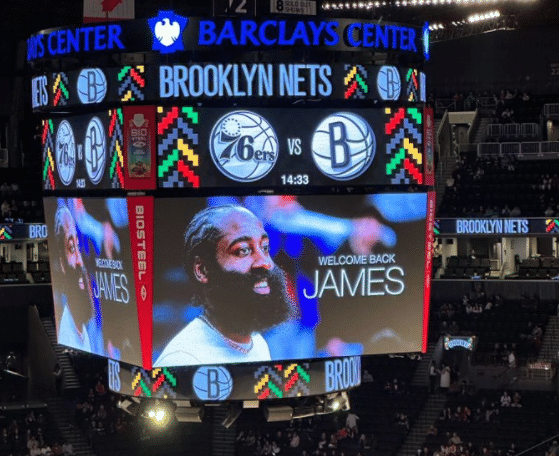 值得一提的是,篮网主场大屏幕上写着欢迎哈登回来。