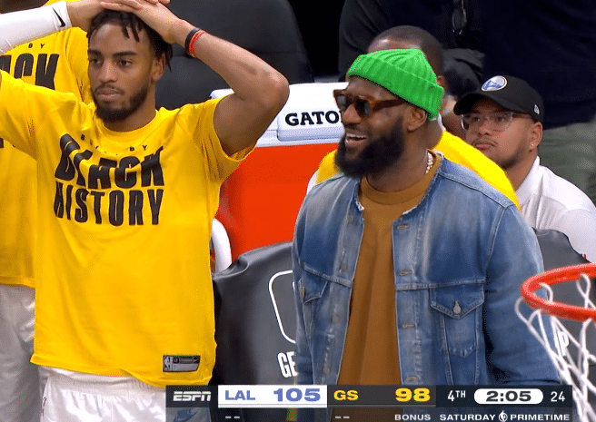 关键时刻,浓眉大帽汤普森,之后浓眉撞倒格林并把球打进,裁判吹罚太晚,老詹无奈苦笑;随后浓眉大帽迪温琴佐,最终湖人客场拿下比赛。