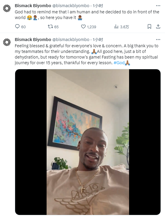 今日,比永博本人发推透露晕倒真因,写道:感恩、感激每个人的爱和关心。非常感谢我的队友们的理解。一切都很好,我只是有点脱水,但我已经为明天的比赛做好了准备!断食是我超过15年的精神之旅,感谢每一次的经验。上帝不得不提醒我是人类,他决定让我晕倒在世界面前。